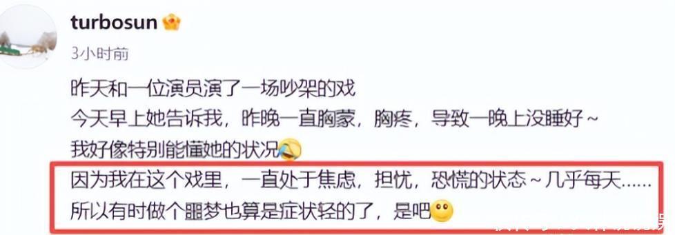 她在社交平台上发文,称:“自己拍戏时,几乎每天处于焦虑、担忧、恐慌的状态,连做噩梦都算轻的。”